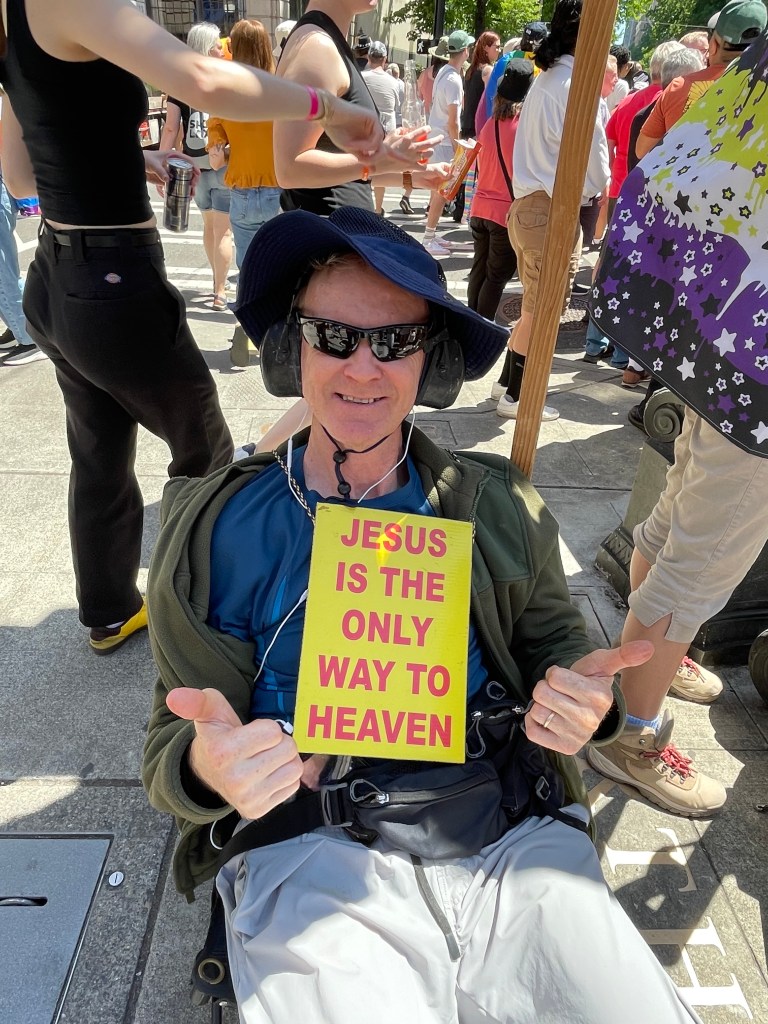 I assume his small sign proclaiming “JESUS IS THE ONLY WAY TO HEAVEN” was intended as a protest. Well, that’s one in 300,000. We’re each, in our uniquely queer way, one in 300,000, one in a million, one in a billion, quadrillion … one.