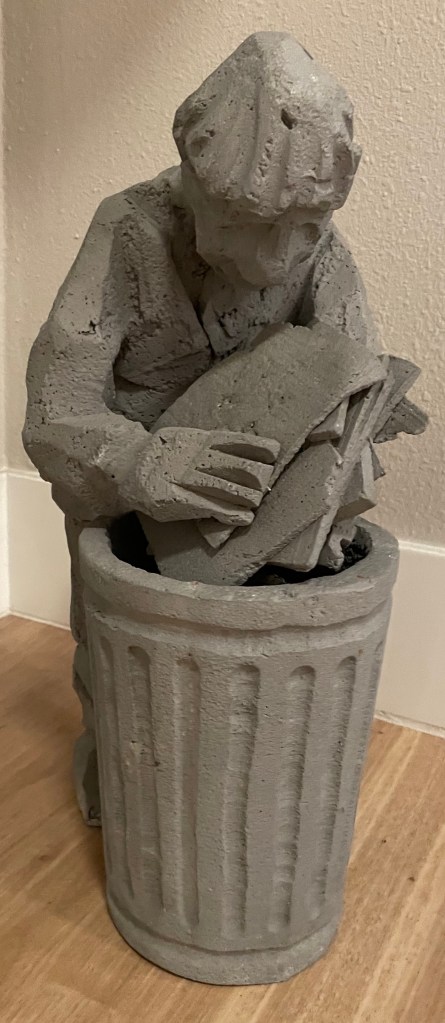 I don’t know if Margaret was aware of my presence. I prayed, seeking forgiveness for not having done more for her. She’d been the rock, the firm foundation that allowed Rich freedom to create. She was equally as brilliant and creative, yet self-effacing. I treasure a small watercolor that Rich gave to me. Margaret had painted it. I also treasure “Man Throwing Newspapers into Garbage Can,” which stands at my apartment door.