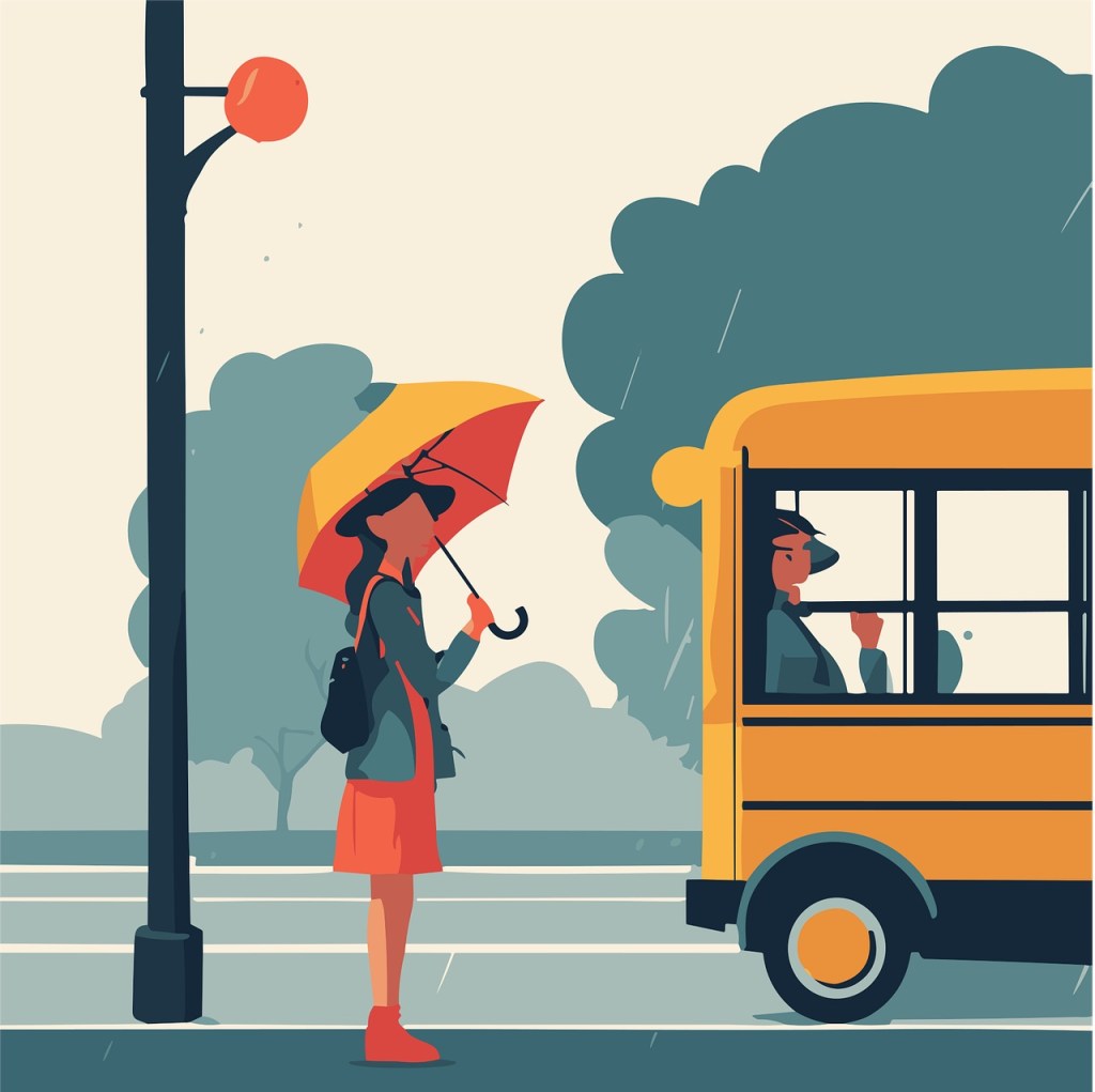 Undeterred by a steady rainfall, my umbrella and I arrived at the deli. The sandwiches I’d ordered online the day before weren’t ready. After a twenty-minute wait, I knew I’d missed the No. 594. I didn’t mind. It runs every thirty minutes, giving me an extra ten minutes to walk more carefully down the steep, rain-slicked sidewalk. By chance a neighbor was also waiting at the bus stop, though headed in a different direction. We agreed that we were fortunate not to be driving through rain and heavy traffic.