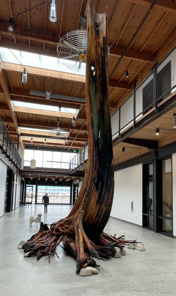 The sculpture, created from the twenty-two foot base and roots of a charred and hollowed western red cedar, is a compelling statement of destruction and resurrection. Tori Karpenko, an artist from Twisp, WA., salvaged the tree’s remains in cooperation with the U.S. Forest Service. Karpenko rubbed oil onto every inch of the massive corpse, giving it an ethereal glow, an essence of life after death.