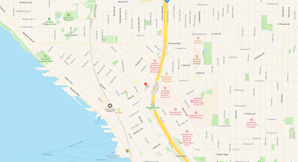 As if all that weren’t sufficiently problematic, interstate freeway construction in the 1960s plowed through Seattle’s core, bisecting the city and blocking streets that long had been thoroughfares between neighborhoods. A “lid” over a small portion of the freeway affords some access via Freeway Park. The retirement complex I live in abuts the park, but even pathways in the park wind and wander. As far as I can tell, GPS has yet to figure out those trails.